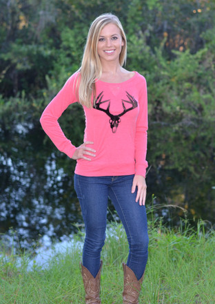 Feel fabulous in this Coral lace back long sleeve top with soft and stylish velvet dark brown deer skull outlined in tiny crystals .